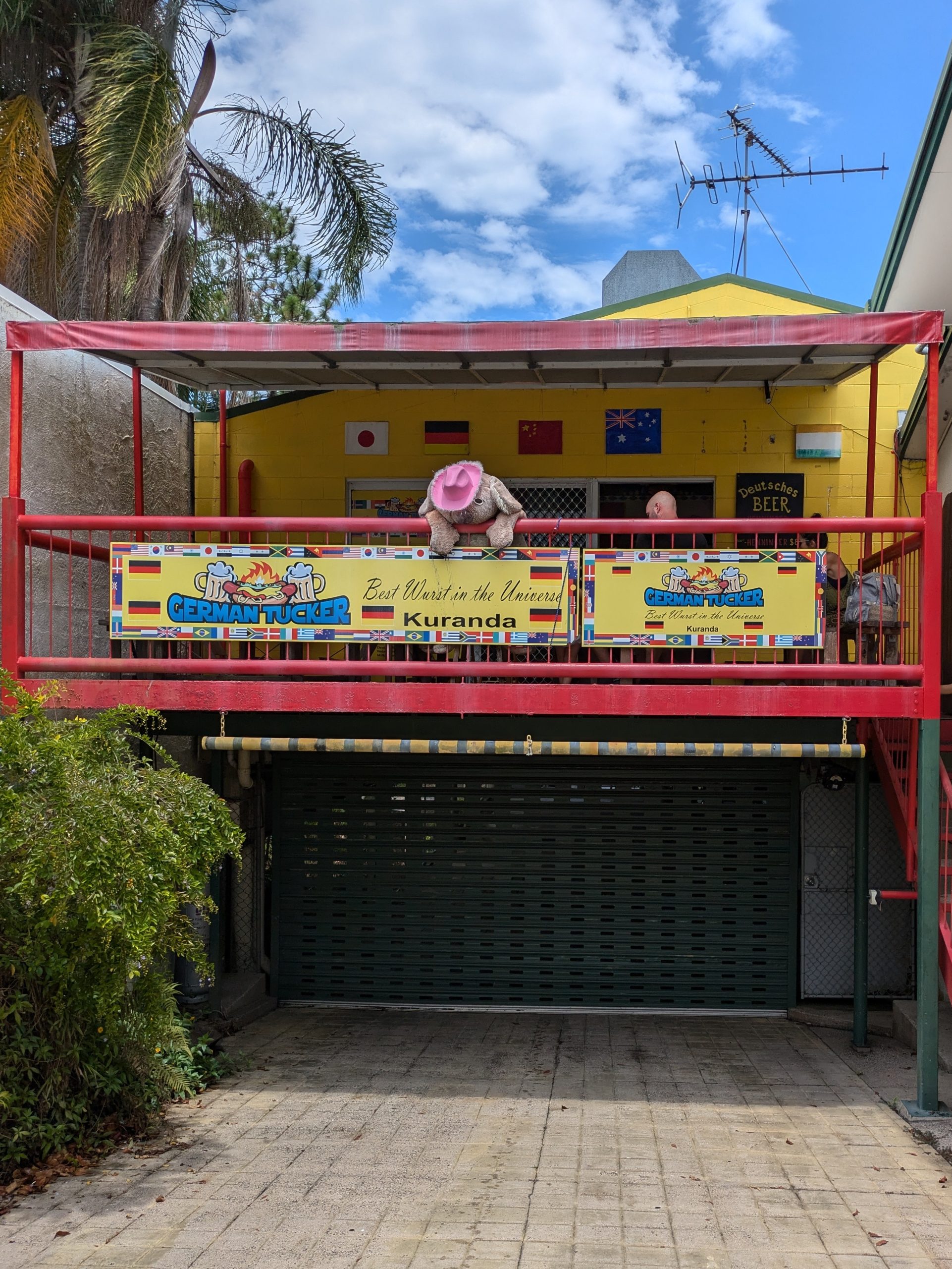 「GERMAN TUCKER」は、キュランダの中心にある赤と黄色の外観が目印のホットドッグ屋さんです。2階テラス席からは、のんびりとした街並みを見渡しながら食事ができます。