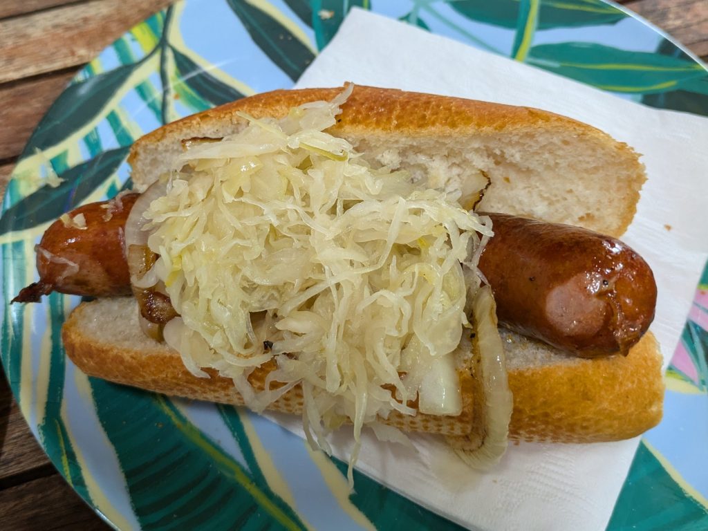 ひと口かじると、ジューシーなソーセージが口いっぱいに広がり、カリッと焼かれたパンとの相性が抜群!添えられたザワークラウトもさっぱりしていて、脂っこさを感じさせません。