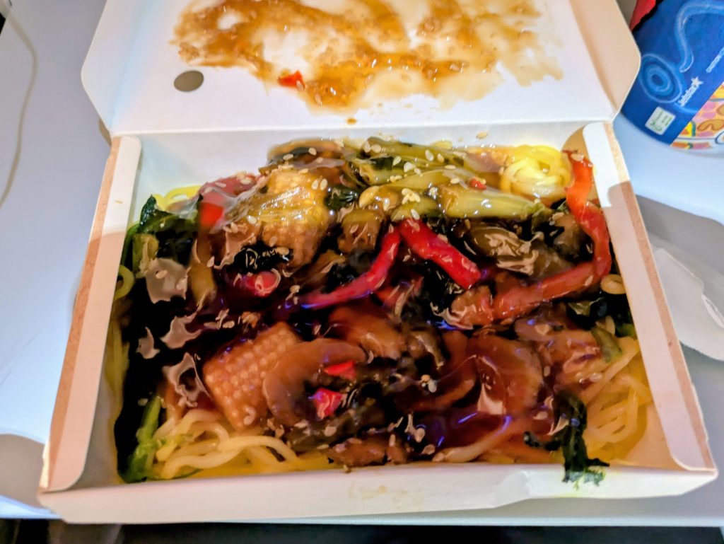 出発は夕方で、機内で夕飯と朝食が提供されます。追加料金での事前予約制ですが、長時間フライトではありがたいオプションです。